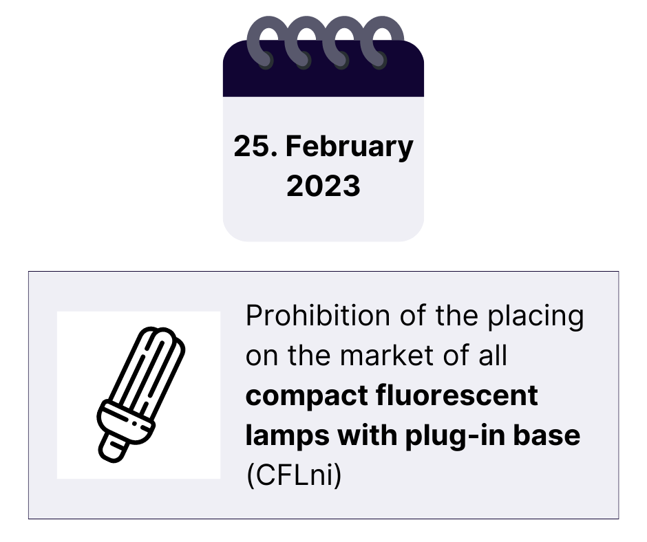 It will also hit compact fluorescent lamps with plug-in bases as early as February 25. An extension of the exemptions to 3-5 years is planned for HPD lamps and special purpose lamps (such as for UV-C disinfection with lamps).