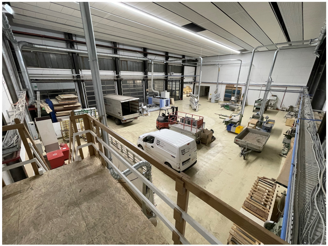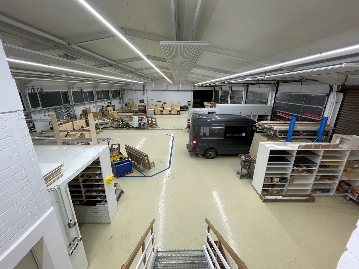 The workshop of the carpenter's workshop Knoche was equipped with REDOX light bands of the manufacturer WASCO after a light calculation and comprehensive consultation. Thus, the hall shines in uniform, bright light without dazzling employees. The new lighting ensures concentrated and thus safe work. In addition, the LED light strips ensure high energy savings and at the same time provide excellent photometric values.
