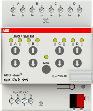 Steuert digital 4 unabhängige Gruppen mit jeweils bis zu 4 SMI-Rollladen- bzw. Jalousieantrieben über ABB i-bus®.