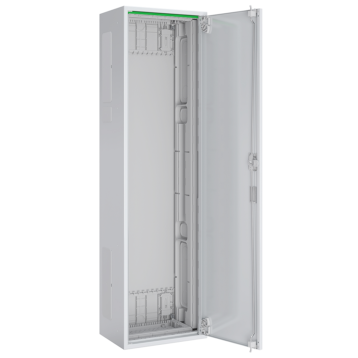 Systemgehäuse für AP-, UP- und teilversenkter Montage, bestehend aus: Leergehäuse mit flächenbündiger Leitungsmembran, seitlichen Vorprägungen für Querverdrahtung im AAR und Sammelschienenverbindung im NAR, Volltür, Abmessungen: 300x1100x210 mm, Schutzklasse II (schutzisoliert), Schutzart IP44, Stahlblech pulverbeschichtet, 84 Teilungseinheiten