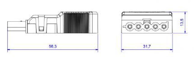 The flat connector has the dimensions 56 x 32 x 14 mm. It has IP20 protection and, when plugged in, IP40 protection.