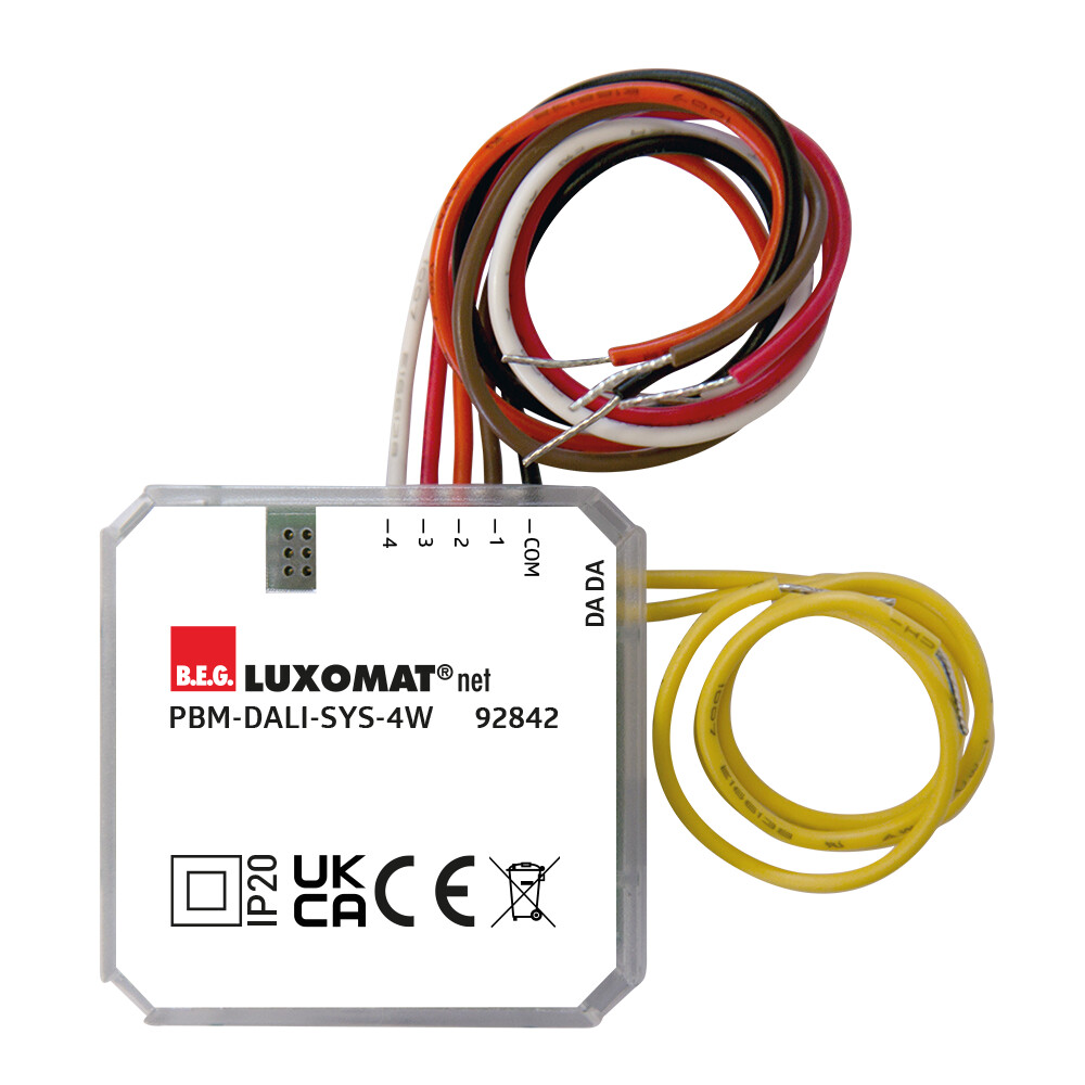 Binäres DALI-Eingabegerät für den Einsatz in Unterputzdosen, 4 beliebig konfigurierbare Eingänge für potentialfreie Taster- und Schaltkontakte, Nahtlose Integration in das skalierbare B.E.G. LUXOMAT(R)net DALI-SYS, Betriebsmodi: Normal-, Treppenhaus- oder Szenenbetrieb, Integrierte LED für Lokalisierung im ausgebauten Zustand, Integrierter Summer für Lokalisierung im eingebauten Zustand, DIP- und HEX-Schalter für schnelle Inbetriebnahme mit Grundfunktionen, Voller Funktionsumfang ist nur mit Zubehör aus B.E.G. LUXOMAT(R)net DALI-SYS-Produktsortiment aktivierbar, Bei diesem Artikel handelt es sich um eine Komponente eines Lichtsteuerungssystems von B.E.G., welches den Einsatz von DALI-Betriebsgeräten (Leuchten, Relais) anderer Hersteller unterstützt, Der Einsatz von DALI-Applikations-Controller anderer Hersteller wird nicht unterstützt, Der Einsatz von DALI-Eingabegeräten (Sensoren, Taster) anderer Hersteller wird nicht unterstützt, Es sind zusätzliche Systemkomponenten (Hardware) von B.E.G. erforderlich, Es sind zusätzliche Dienstleistungen (Planung, Inbetriebnahme und Wartung) von B.E.G. erforderlich