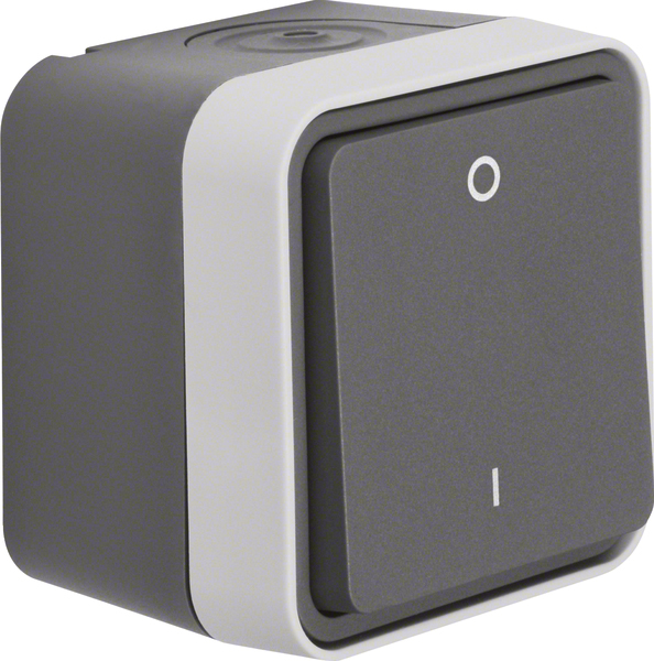 Ausschalter 2-polig mit Aufdruck '0' und '1' AP W.1 grau. Ausschalter 2-polig mit Aufdruck - 0 - und - I - AP, IP55, mit mechanischer Kodierung der Wippenaufnahme, die nur ein lagerichtiges Aufstecken der Wippe auf den Einsatz ermöglicht, mit N-Klemme, mit Steckklemmen, mit einer Einführung für 2 Leitungen und einer Einführung für Leitung oder Rohr, vollflächige Dichtung unter dem Gehäuseboden zur Abdichtung der Gehäuserückseite, gut zugängliche, trichterförmige Montagelöcher in den Gehäusen, eine Wago 2-Leiter Verbindungsklemme für Verdrahtung beiliegend, zwei Einrastplätze für Wago 2-Leiter Verbindungsklemmen im Gehäuseboden, viel Platz zur Verdrahtung unter den Sockeln der Einsätze (Hohlboden), einfache Montage des Einsatzes im Gehäuse durch Einrasten, sichere Fixierung des Rahmens am Gehäuse über Bajonett-Schnellverschluss, Gehäuseschrauben aus Edelstahl Rostfrei. Aufputz-Installation. Material: Kunststoff, Thermoplast, schlagfest.