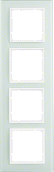 Glasrahmen 4fach B.7 polarweiß. Abdeckrahmen für senkrechte und waagerechte Montage für Verwendung von polarweißen Zentralstücken, (B x H) 95 x 303mm. Unterputz-Installation, Flächen-/Designprogramm, 4-fach. Material: thermisch gehärtetes Glas und Kunststoff, Thermoplast, bruchsicher, halogenfrei.