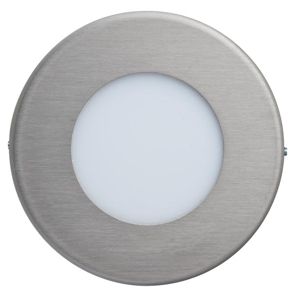 LED recessed wall light, stainless steel, round. Recessed mounting, wall mounting. Incl. converter for connection to 230 V mains voltage, switchable, and cavity wall mounting box Ø 68 mm / installation depth: 65 mm. Mounting type: flush mounting, mounting location: wall mounting, material: stainless steel / acrylic / plastic, protection class: according to DIN EN 60529: IP20, protection class: (EN 61140) I, voltage: 230V AC 50Hz, power: 1.2W, number of lamps / sockets: 1.0 pc, luminous flux: 40lm, color temperature: 3000 K, light color: white, with control gear, type of dimming: switchable.