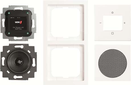 Einbaufertiger DAB+-Radiowecker für Monobetrieb (Set-Verpackung). Mit hochauflösendem Farbdisplay zur Anzeige von Zusatzinformationen. Bestehend aus Busch-Radio DAB+ 8215 U-101. Bestehend aus Lautsprecher-Einsatz 8223 U. Bestehend aus Zentralscheibe für Busch-Radio 8252-84-101. Bestehend aus Zentralscheibe für Lautsprecher-Einsatz 8253-84. Bestehend aus 2-fach future® linear Abdeckrahmen 1722-184K. Keine Spreize. Schraubbefestigung über Schlüssellöcher.