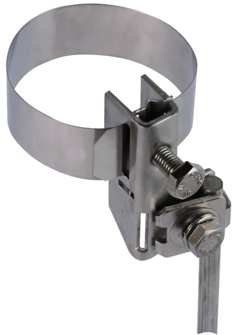 Antennen-Bandrohrschelle nach DIN EN 62561-1, zum Einbinden von Rohren in den Schutz und Funktionspotentialausgleich nach DIN VDE 0100-410/540 und den Blitzschutz-Potentialausgleich nach DIN EN 62305-3 (VDE 0185-305-3). Ausführung komplett mit stetig verstellbarem Spannband aus NIRO, zum Anschluss von 1 Leiter Rd D10 mm oder 1-2 Leiter Rd D6-8 mm oder 4-50 mm² (ein- / mehrdrähtig).