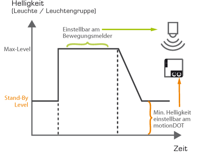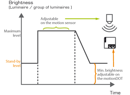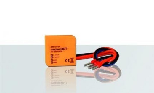 By motionDOT the lighting control on demand in the DALI bus can be implemented extremely cost effective.Due to the small and compact design, the motionDOT module is easy to install in flush or surface doses. Choosing the command receiver on motionDOT done easily via rotary switch. At a second rotary switch, the brightness level is set to the lamp or the lighting group to be dimmed when the motion detector no activity registered. As a result, for example, a basic safety lighting can be realized.The motionDOT is multi-controller capability, meaning that several modules in the DALI bus can be used.