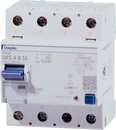 Fehlerstromschutzschalter (RCCB) schalten die Stromversorgung ab, wenn gefährlich hohe Fehlerströme auftreten. Sie schützen so Personen, Tiere und Anlagen. DFS 4 sind zwei- oder vierpolige Fehlerstromschutzschalter für ein- oder dreiphasige Netze. In Standardausführung sind die kompakten Geräte vier Teilungseinheiten schmal. Sie sind mit vielen verschiedenen Fehlerstromtypen und Ausführungen bei Bemessungsströmen bis zu 125 A erhältlich. Die großen Doppelstockklemmen können auch große Leiterquerschnitte aufnehmen. Die Ausgelöststellung des Multifunktionsschaltknebel erleichtert die Fehlersuche. Die kostenlose Etikettensoftware hilft bei der Beschriftung. Schalter des Typs B sind allstromsensitiv bei Frequenzen von 0 Hz (glatten Gleichfehlerströmen) bis 150 kHz. Sie sind erhöht stoßstrom- und gewitterfest. Fehlerstromschutzschalter der Baureihe SK stehen für Fehlerstromschutz und eine hohe Anlagenverfügbarkeit. Sie zeichnen sich durch eine geringere Ansprechempfindlichkeit bei höheren Frequenzen aus. Die Kennlinie SK ist für Anlagen optimiert, in denen kein Brandschutz erforderlich ist. Geräte in Standardausführung sind für die Überwachung von Stromkreisen mit einer Bemessungsspannung von 230, 400 V, V und einer Bemessungsfrequenz von 50 Hz ausgelegt. Eigenschaften: hohe Immunität gegenüber betriebsbedingte Ableit- und Fehlerströmen bei Frequenzen ab 1 kHz