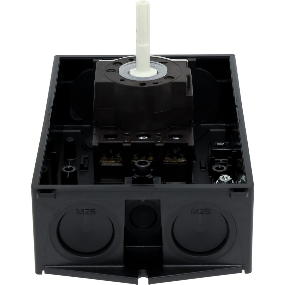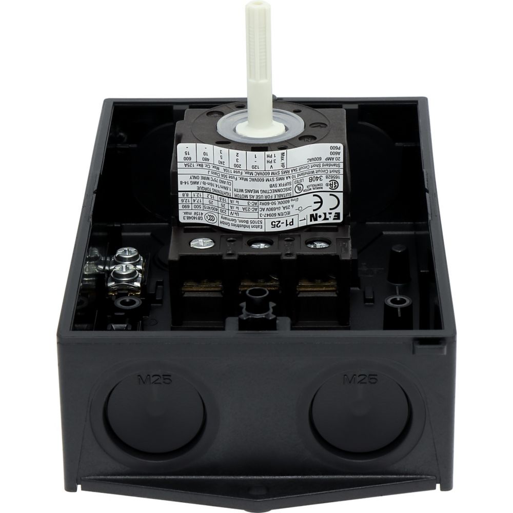 Hauptschalter, Sortiment: Hauptschalter, Wartungsschalter, Typkenner: P1, STOPP-Funktion: NOT-AUS-Funktion, mit rotem Drehgriff und gelbem Sperrkranz, Information zum Lieferumfang: Hilfsschalterkontakt oder Neutralleiter nachrüstbar., 3-polig, Abschließbarkeit: abschließbar in 0-Stellung, Schutzart: IP65, Bauform: Aufbau, Bemessungsbetriebsleistung AC-23A, 50 - 60 Hz 400 V: P = 11 kW, Bemessungsdauerstrom: Iu = 25 A, Normen und Bestimmungen: IEC/EN 60947, VDE 0660, IEC/EN 60204, Lasttrennschalter nach IEC/EN 60947-3