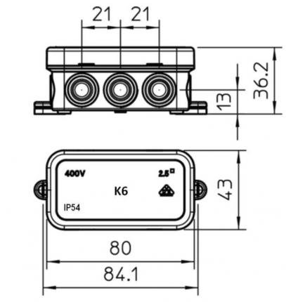 The Electro Terminal junction box has a nominal cross-section of 2.5 mm², 6 entries for cable diameters of 7-14 mm, 4 entries for cable diameters of 7-9 mm and a clamping cover. It has the dimensions 85 x 43 x 34 mm and the clearance 70 x 32 x 31 mm.