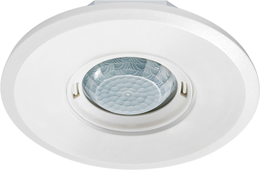 Design-Bewegungsmelder, Reichweite ca. 8 m im Ø. 1 Kanal, Schalten, mit Nulldurchgangsschaltung optimiert für LED-Leuchten. Master/Slave (Parallelschaltung). Flache Optik mit vergrößerter Design-Abdeckungen aus Kunststoff (Ø 104mm): rund, weiß - variabel austauschbar (alternativ: Glas, quadratisch, schwarz). Unterputz und Deckeneinbau. Tastereingang.