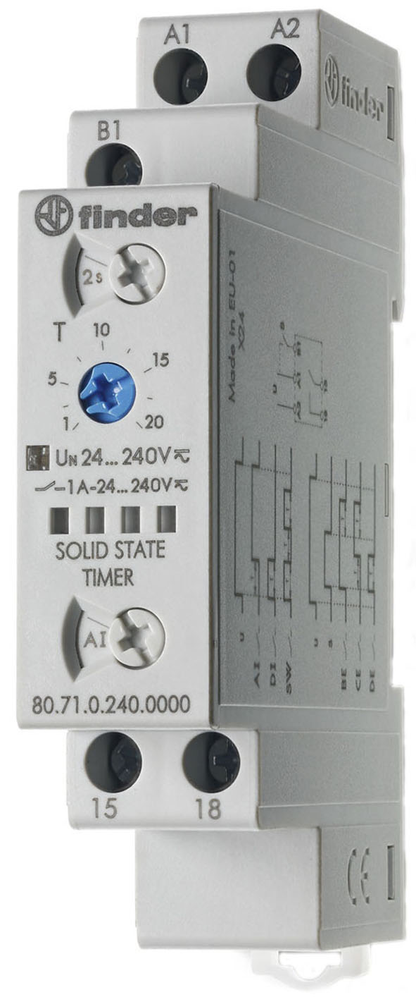 Multifunktions-Zeitrelais mit Halbleiterausgang für DIN-Schiene, 17.5 mm breit, 1 Schließer 1 Ampere Dauerstrom, 10 A max. Einschaltstrom für 10 ms, Funktionen: AI: Ansprechverzögerung, DI: Einschaltwischer, SW: Impulsrelais (Blinker)impulsbeginnend, BE: Rückfallverzögerung, CE: Ansprech-/Rückfallverzögerung, DE: Impulsformer(Einschaltwischer), Zeitbereich: 0,1 s - 24 h Versorgungsspannung: 24-240 V DC/AC (50/60 Hz), Relaisschutzart: IP 20