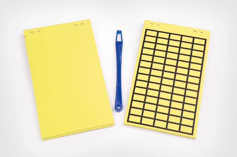 Etiketten aus Gewebefolie im handlichen Taschenbuchformat Optimaler Schutz vor Staub und Schmutz durch das Taschenbuchdeckblatt Leichtes Entfernen oder Neupositionieren der Etiketten, je nach Bedarf Beim Entfernen verbleiben keine Klebstoffrückstände Mit (FB) oder ohne (B) schwarzem Abschlussrahmen erhältlich Auch für schwierige Untergründe geeignet Markierstift T82 für professionelle und dauerhafte Handbeschriftung Hilfswerkzeug für saubere Platzierung der Etiketten enthalten Die Etiketten sind optimal zur flexiblen Kennzeichnung von Bauteilen, Schaltgeräten und anderen Betriebsmitteln mit der Hand geeignet. Dank des Kautschukklebstoffes lassen sie sich rückstandsfrei wieder ablösen. Für die professionelle Handbeschriftung empfehlen wir den Markierstift T82, ausgestattet mit einer schnell trocknenden und UV-beständigen Tinte.