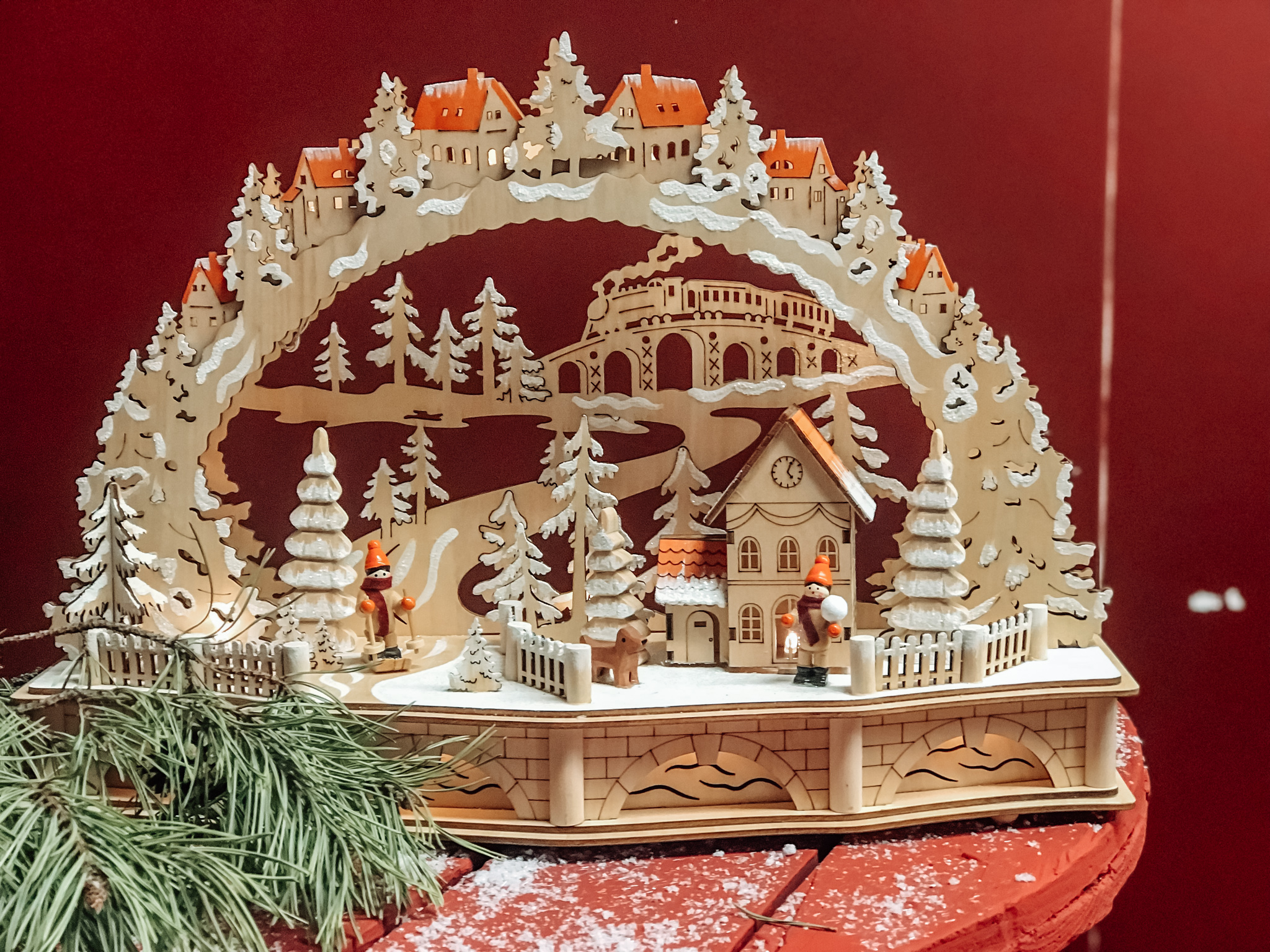 LED-Holzleuchter Dorf- und Zugszene, 6h-Timer, batteriebetrieben, ohne Batterien (2 x AA),