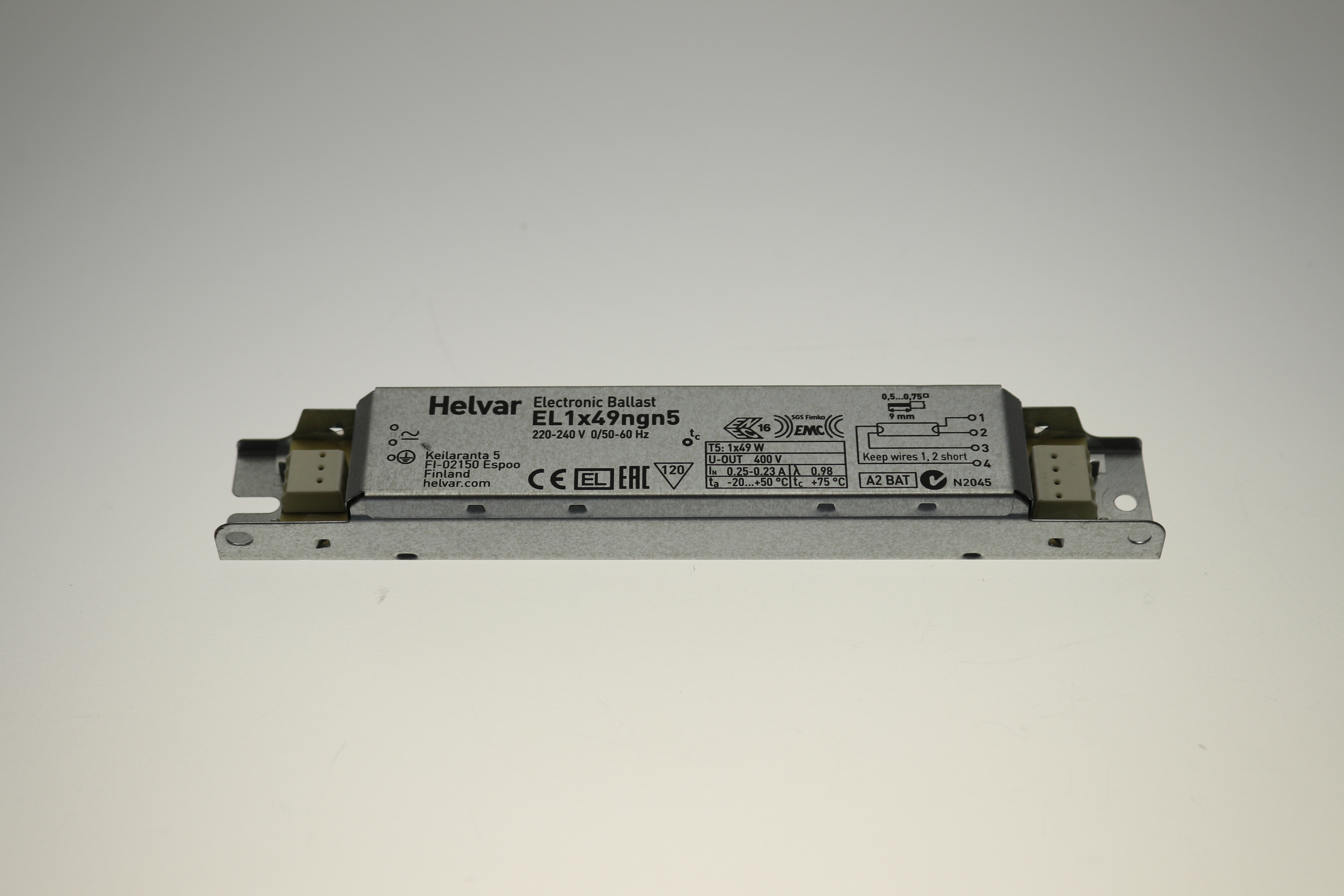 The electronic ballast EL1x49ngn5 for T5 fluorescent lamps by Helvar is suitable for luminaire installation. It has a maximum rated power of 49 watts. The ballast features an excellent thermal design that delivers the highest energy savings and highest reliability - thus minimizing the impact on the environment. The FL ECG has energy efficiency class A2 BAT.