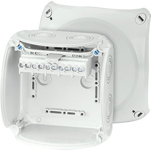 Kabelabzweigkasten aus hochwertigem Thermoplast für die ungeschützte Installation im Freien oder Aufputz-Anwendungen in Gebäuden. Beständig gegen Witterungseinflüsse wie UV-Belastung durch Sonneneinstrahlung, geschützt gegen Regenwasser, temperaturbeständig und schlagfest. Deckelbefestigung über Schnellverschlüsse. Mit Außenlaschen zur Befestigung. Seewasserbeständig, für Offshore-Anwendungen. Mit Zulassung für die Installation auf Schiffen. Klemme mit 2 Klemmstellen je Pol bis 6 mm², 5-polig. Kabeleinführung über metrische Vorprägungen in Gehäusewänden und Boden. Anbau-Kabelstutzen im Zubehör. Mit Deckelhalteband.