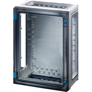 Gehäuse mit Tür für den Bau von Installationsverteilern bis 250 A für die Bedienung durch Laien nach IEC 61439-3. Offene Gehäusewände für die Kombination oder als Einzelgehäuse mit Verschlussplatten. Aus hochwertigem Polycarbonat, schutzisoliert. Schnelle Gehäuseverbindung durch Steckverbinder und integrierte Dichtungen. Große Wanddurchführungen für die elektrische Verbindung der Gehäuse untereinander. Kabeleinführung über Flansche. Wandbefestigung direkt am Gehäuse, über Außenlaschen oder mit Montageschienen. Leergehäuse mit transparenter Tür und Türverschluss mit Werkzeugbetätigung. Für den Einbau von Geräten auf Montageplatte oder DIN-Tragschiene, Einbaumaße B 216 x H 306 x T 140 mm. Max. Einbautiefe bei eingebauter Montageplatte 136 mm, bei eingebauter Tragschiene 125 mm. Die Plombiervorrichtung für die Türplombierung muss separat bestellt werden.