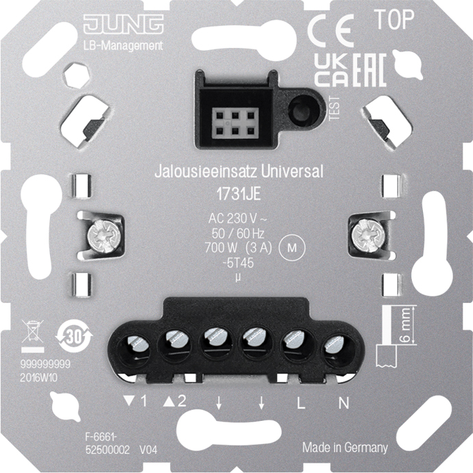 mit Nebenstelleneingang für Aufsätze JUNG HOME Art.-Nrn.: BT .. 17101 .., BT .. 17102 .. für Aufsätze eNet Art.-Nrn.: FM .. 1700 .., FM .. 1701 .. für Aufsätze LB-Management Art.-Nrn.: .. 1700 .., .. 1750 D .. für Aufsätze KNX RF Art.-Nrn.: .. 10911 ST RF .., .. 10921 ST RF .. Bestimmungsgemäßer Gebrauch Steuern elektrisch betriebener Jalousien, Rollläden und Markisen Automatische Zeitsteuerung über Aufsatz oder Nebenstelleneingänge Betrieb mit geeignetem Aufsatz Montage in Gerätedose mit Abmessungen nach DIN 49073 Produkteigenschaften Über Nebenstelleneingänge ist die Einbindung in Gruppen- oder Zentralsteuerungen möglich Automatische Steuerung über Timer Testbetrieb zur Funktionsprüfung Betrieb als Hauptstelle oder Nebenstelle Windalarm-Verriegelung über den Nebenstelleneingang Umpolfunktion der Ausgänge zur vereinfachten Inbetriebnahme ab Version V01 Speicherung einer Lüftungsposition über den Aufsatz möglich Nennspannung: AC 230 V ~ Netzfrequenz: 50/60 Hz Umgebungstemperatur: -5 ... +45 °C Kontaktart: µ Standby-Leistung: max. 0,2 W Laufzeit: ca. 120 s Anschlussleistung Motoren: 700 W Anschluss Anschlussart: Schraubklemmen eindrähtig: 1 x 0,5 ... 4,0 mm2 2 x 0,5 ... 2,5 mm2 feindrähtig ohne Aderendhülse: 1 x 0,5 ... 4,0 mm2 2 x 0,5 ... 2,5 mm2 feindrähtig mit Aderendhülse: 1 x 0,5 ... 4,0 mm22 x 0,5 ... 1,5 mm2