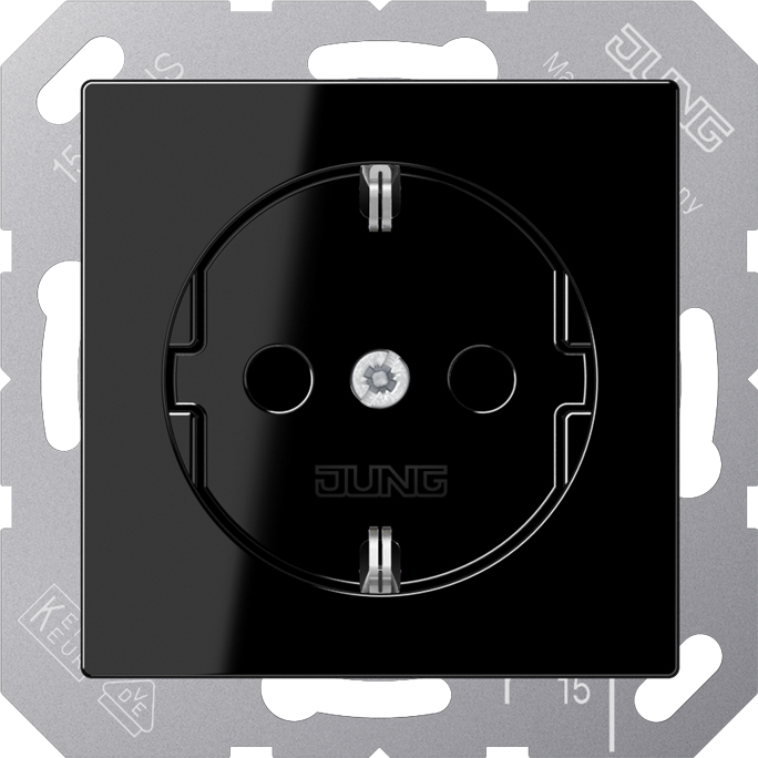 Schutzkontakt®-Steckdose, schwarz mit Federklemmen für starre und unbehandelte flexible Leiter bis 2,5 mm2 Verbindungsklemmen nach DIN VDE 0620 Tragring, Krallen und Krallenschrauben sind über eine Erdungsschiene in die Schutzmaßnahme eingebunden. Material: Duroplast Maße (B x H): 55 x 55 mm