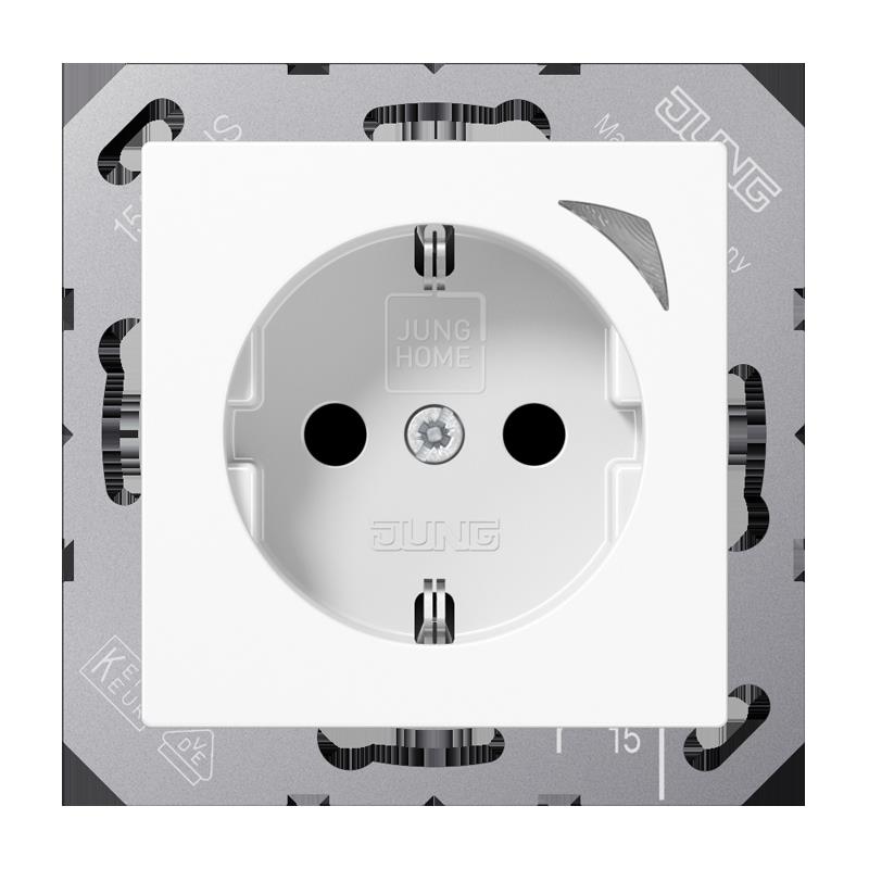 JUNG HOME Schutzkontakt® Steckdose, alpinweiß mit integriertem erhöhten Berührungsschutz (Safety Plus) mit Schraubklemmen für starre und flexible Leiter bis 2,5 mm2 Verbindungsklemmen nach DIN VDE 0620 Tragring, Krallen und Krallenschrauben sind über eine Erdungsschiene in die Schutzmaßnahme eingebunden. Bestimmungsgemäßer Gebrauch Manuelles oder automatisches Schalten von Beleuchtung und haushaltsüblichen Geräten Drahtlose Verknüpfung mit Geräten des JUNG HOME Systems Einsatz im trockenen Innenbereich Montage in Gerätedose mit Abmessungen nach DIN 49073 Tiefe der Gerätedose (Innenmaß): min. 53 mm Produkteigenschaften Inbetriebnahme und Bedienung über JUNG HOME App mit mobilem Endgerät (Smartphone oder Tablet) über Bluetooth® Taste zum Schalten Mehrfarbige Statusanzeige mit optionalem Nachtmodus Sperren der lokalen Bedienung Bis zu 16 Zeitprogramme Einbindung der Last in Bereiche (Gruppen), Zentralfunktionen und Szenen Automatikfunktionen aktivieren/deaktivieren über JUNG HOME App Automatische Datum- und Uhrzeitaktualisierung bei Verbindung mit Smartphone Integrierter Schaltaktor mit 16 A Bluetooth® SIG Mesh für voll verschlüsselte drahtlose Kommunikation und Repeaterfunktion Updatefähig über JUNG HOME App Zukünftig per Update verfügbar: (Hinweise zu Updates und Terminen finden sie unter www.jung.de/JUNGHOME) Sperr- und Zwangsführung: Dauer-EIN/AUS oder für feste Zeit EIN/AUS Zeitprogramme mit Sonnenauf- bzw. Sonnenuntergang (Astrotimer) Zeitprogramme mit Zufallszeitpunkt Ein-/ Ausschaltverzögerung Eingespeiste Leistung von -0,1 bis -3680 Watt und eingespeiste Energie (kWh) Material: Thermoplast Maße (B x H): 55 x 55 mm