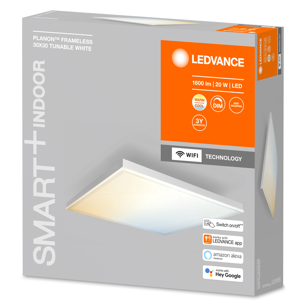 Frameless panel lights with WiFi technology. Product properties: controllable via Ledvance Smart+ WiFi app (with at least Androidâ "¢ ï¸ 4.4 or iOS 9.0). Dimmable. Control via Google Assistant or Amazon Alexa possible. Coloring temperature via Tunable White adjustable: 3,000 ... 6,500 K. Network protocol: WIFI. Product advantages: easy and quick installation. Areas of application: interior applications. Kitchen, living, children's or study. Technical equipment: contain wings. Including assembly screws and dowels. Control via app or voice control requires compatible smart home system. A smartphone or tablet is required for control via Ledvance Smart + WiFi app