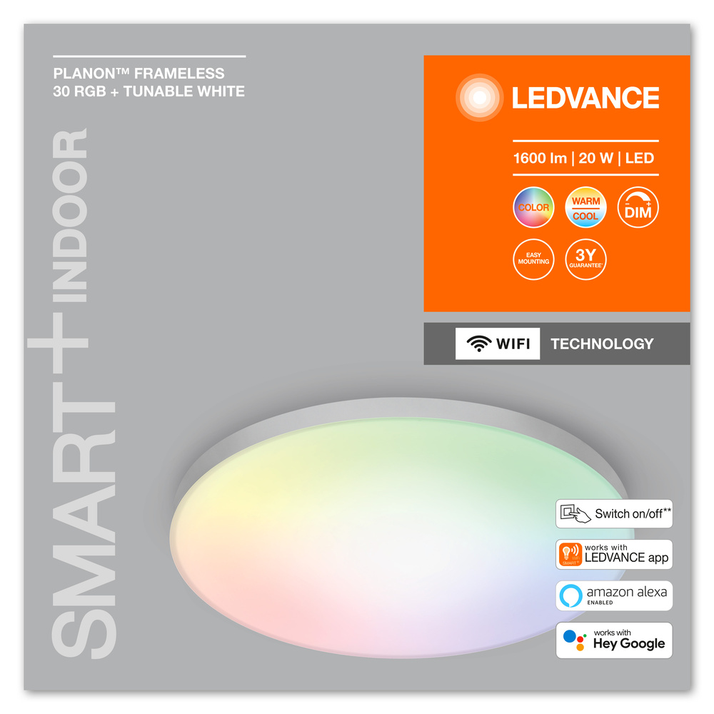 Frameless panel lights with WiFi technology. Product properties: controllable via Ledvance Smart+ WiFi app (with at least Androidâ "¢ ï¸ 4.4 or iOS 9.0). Control via Google Assistant or Amazon Alexa possible. RGB dye control, approx. 16 million color options adjustable. Color temperature via Tunable White adjustable: 3,000 ... 6,500 K. Dimmable. Network protocol: WiFi. Product advantages: easy and quick installation. Areas of application: interior applications. Kitchen, living, children's or study. Technical equipment: contain wings. Including assembly screws and dowels. Control via app or voice control requires compatible smart home system. A smartphone or tablet is required for control via Ledvance Smart + WiFi app
