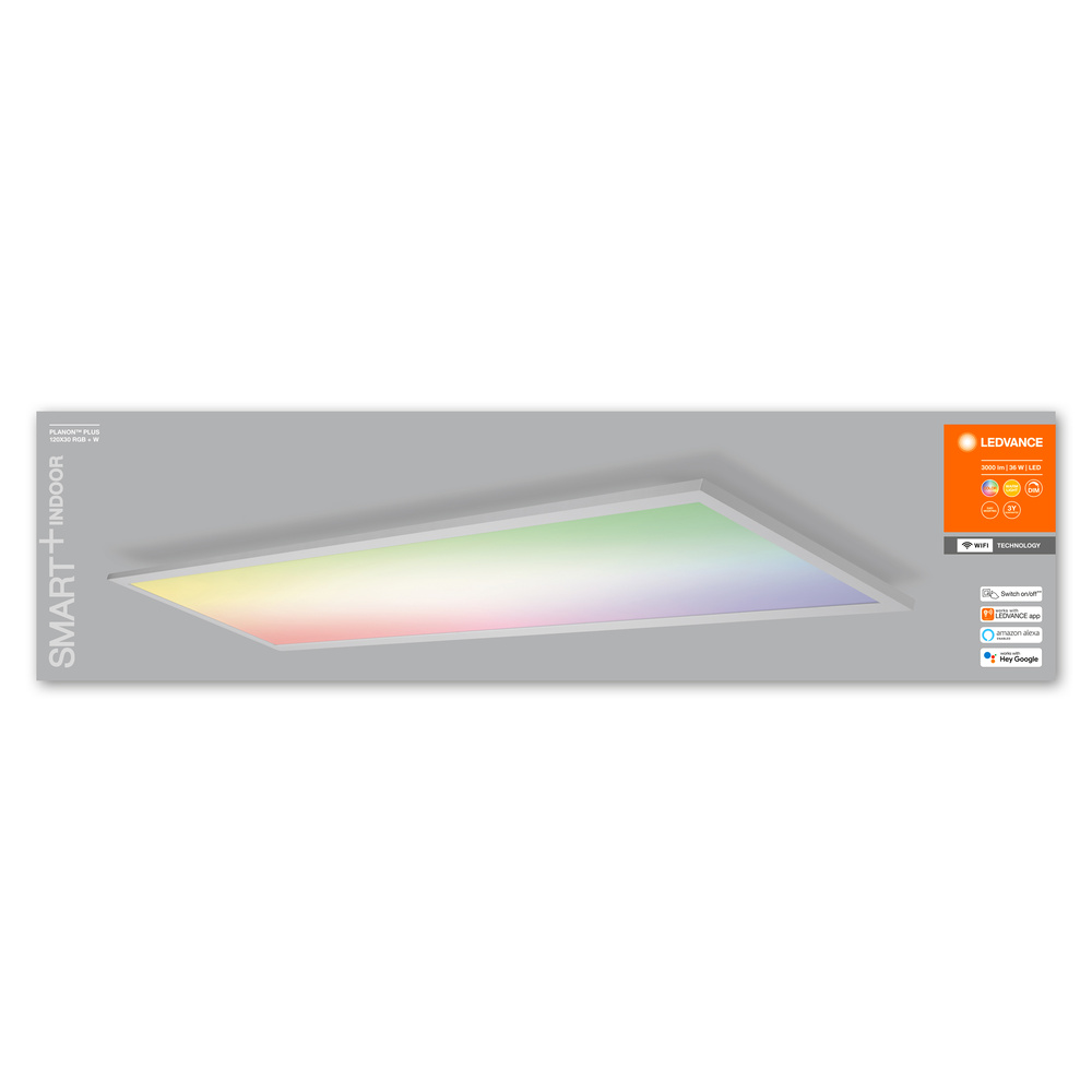 Panel lights with WiFi technology. Product properties: controllable via Ledvance Smart+ WiFi app (with at least Androidâ "¢ ï¸ 4.4 or iOS 9.0). Control via Google Assistant or Amazon Alexa possible. RGB dye control, approx. 16 million color options adjustable. Dimmable. Color temperature: 3,000 K (warm white). Network protocol: WiFi. Product advantages: easy and quick installation. Areas of application: interior applications. Kitchen, living, children's or study. Technical equipment: contain wings. Including assembly screws and dowels. Control via app or voice control requires compatible smart home system. A smartphone or tablet is required for control via Ledvance Smart + WiFi app