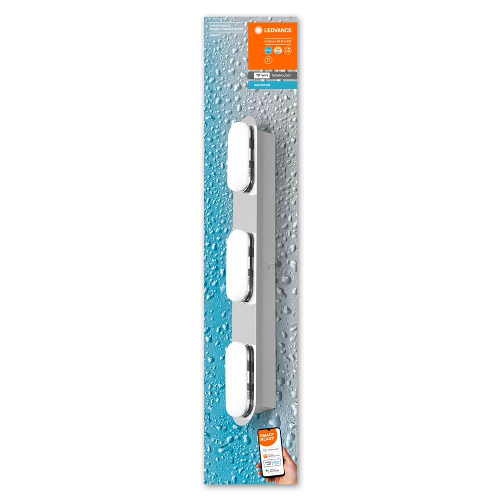 Smart bathroom decorative ceiling and wall with WLAN technology IP44 TW and dimmable. Product properties: Protection class: IP44. Taxed via Ledvance Smart+ WiFi app (with at least Androidâ ¢ ï¸ 4.4 or iOS 9.0). Control via Google Assistant or Amazon Alexa possible. Coloring temperature via Tunable White adjustable: 3,000 ... 6,500 K. Dimmable. Network protocol: WiFi. Product advantages: easy and fast installation. Areas of application: bathroom. Technical equipment: contain wings. Including assembly screws and dowels. Control via app or voice control requires compatible smart home system. A smartphone or tablet is required for control via Ledvance Smart + WiFi app