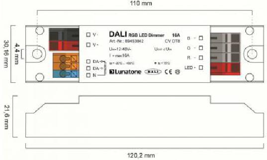 The Lunatone RGB constant voltage DALI LED Dimmer DALI RGB CV 10 A with 10 A maximum input currents is suitable for the control of constant voltage LED modules. The maximum input current can be distributed on the channels at will.
