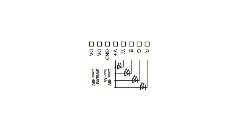 The Lunatone DALI RGBW LED Dimmer CV has a switchable PWM frequency (122Hz / 244Hz / 488Hz / 976Hz) and a supply voltage of 12V to 48V DC. The maximum connection current of 8 A can be distributed arbitrarily to the channels.