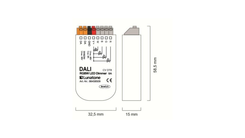 Using the DALI LED dimmer with RGBW color control and DT8 or Color & Dim mode from Lunatone, you can control constant voltage LED modules. The dimmer is suitable for luminaire installation.