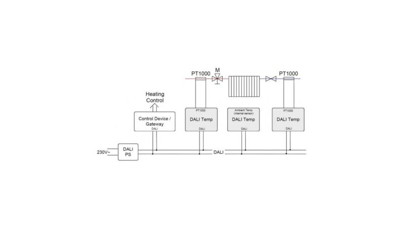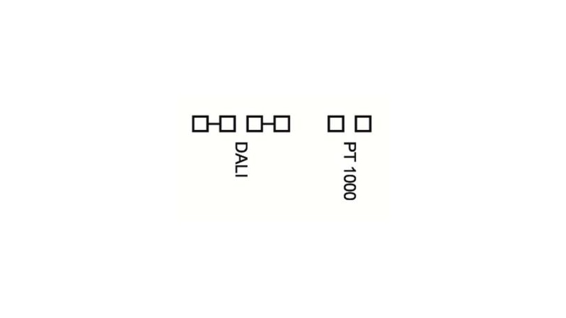 The DALI Temp PT1000 is suitable for temperature measurement. The measured value can be read out via DALI scene values. In addition to the internal temperature sensor, a PT1000 measuring sensor can be connected externally, for example to monitor the temperature of a luminaire, to control blinds or to determine temperature values such as the flow and return temperature of a heating system and to display them via the DALI Visual app.