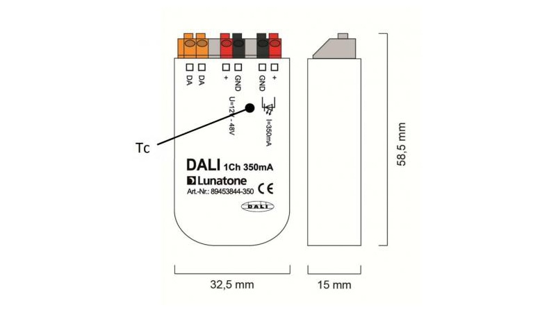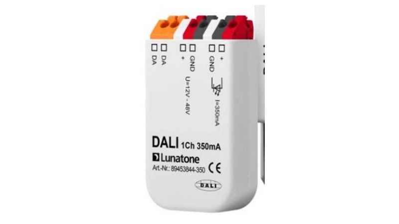 The Lunatone 1-channel constant current DALI LED Dimmer DALI 1Ch CC 350mA with max. input currents of 350mA is suitable for the control of constant current LED modules.