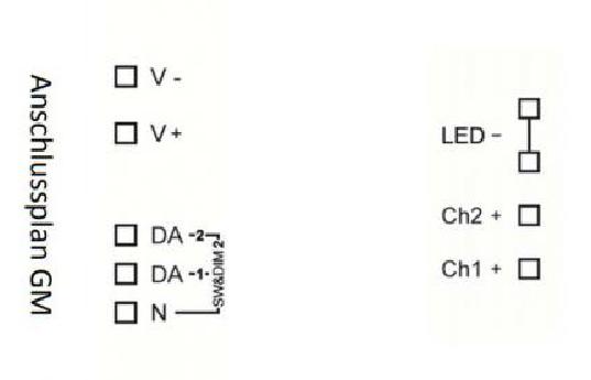 In DT6 mode, the channels are controlled separately via 2 DALI addresses. In Balance & Dim mode, control takes place via 2 DALI addresses, one for adjusting the brightness and one for adjusting the channel distribution (e.g. color temperature). In Dim2Warm mode there is one DALI address for dimming with simultaneous change of the color temperature. The SwitchDim2 operating mode allows operation via 2 button inputs and thus the control of brightness and color temperature without DALI.