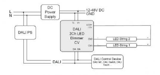 The Lunatone DALI LED dimmer has an adjustable PMW frequency (122Hz / 244Hz / 488Hz / 976Hz). The supply voltage is 12V to 48V DC.