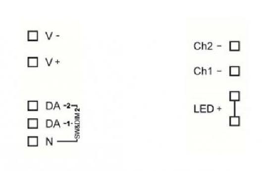 The Dim2Warm operating mode allows simultaneous adjustment of light level and colour temperature) via one DALI-adress. In SwitchDIM2 operation, light level and color can be controlled via 2 button inputs without DALI.