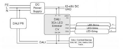 The Lunatone DALI LED dimmer has an adjustable PMW frequency (122Hz / 244Hz / 488Hz / 976Hz). The supply voltage is 12V to 48V DC.