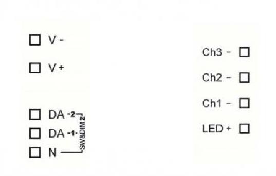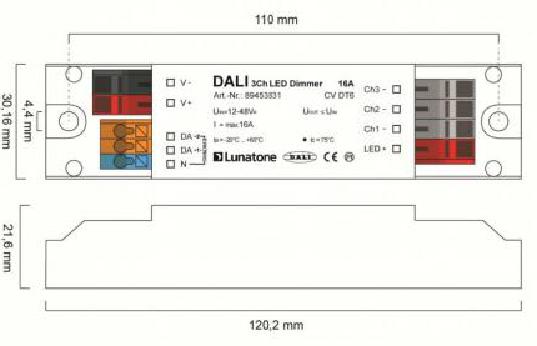 The Lunatone 3-channel constant voltage DALI LED Dimmer DALI 3Ch CV 10A with max. input currents of 10A is suitable for the control of constant voltage LED modules. The max. input current can be distributed to the channels at will.