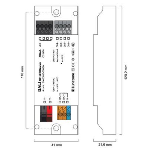 The Lunatone 4-channel constant current DALI DT6 LED dimmer for connection currents of 500 mA enables light regulation via DALI MC / Switch / Touchpanel. It has a dimming range from 0.1% to 100% and a switchable PWM frequency (122Hz / 244Hz / 488Hz / 976Hz). It also has a common negative pole. The LED dimmer is suitable for flush mounting.