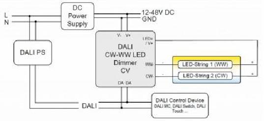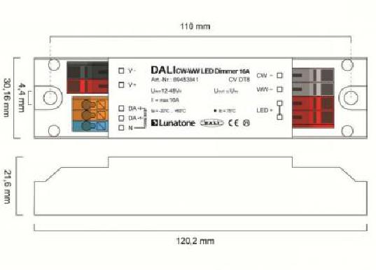 The Lunatone CW-WW constant voltage DALI LED Dimmer DALI CW-WW CV 10A with input currents of 10A is suitable for the control of constant voltage LED modules. The maximum input current can be distributed to the channels at will.