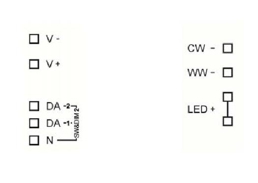 The Dim2Warm operating mode allows simultaneous adjustment of light level and colour temperature) via one DALI-adress. In SwitchDIM2 operation, light level and color can be controlled via 2 switch inputs without DALI.