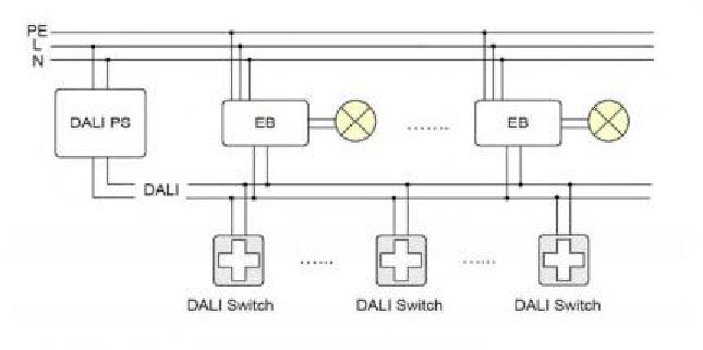 Multiple DALI Switch Cross modules can be used on the same DALI signal line. The module is supplied via the DALI signal line. The housing is IP20 protected.
