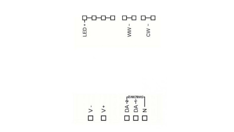 The operating mode DT8 has one DALI address for the independent control of light level and colour temperature (DALI DT8, Colour Type Tc). In Balance & Dim operating mode, the light is controlled via 2 DALI addresses, one for adjusting the light level and one for adjusting the channel balance (e.g. colour temperature). The operating mode Dim2Warm has one DALI address for simultaneous adjustment of light level and colour temperature. There are also 2 switch inputs for level and color temperature control without DALI (SwitchDim2).