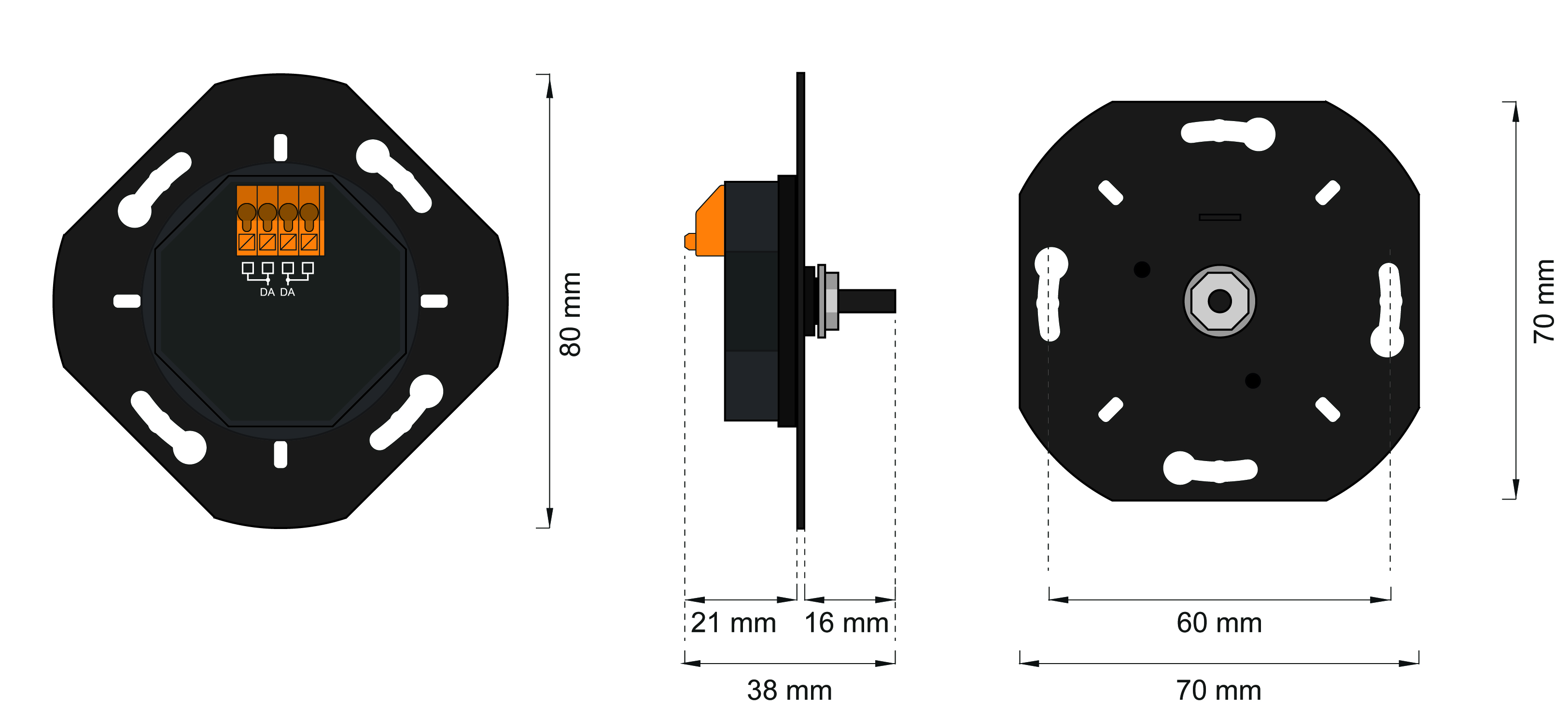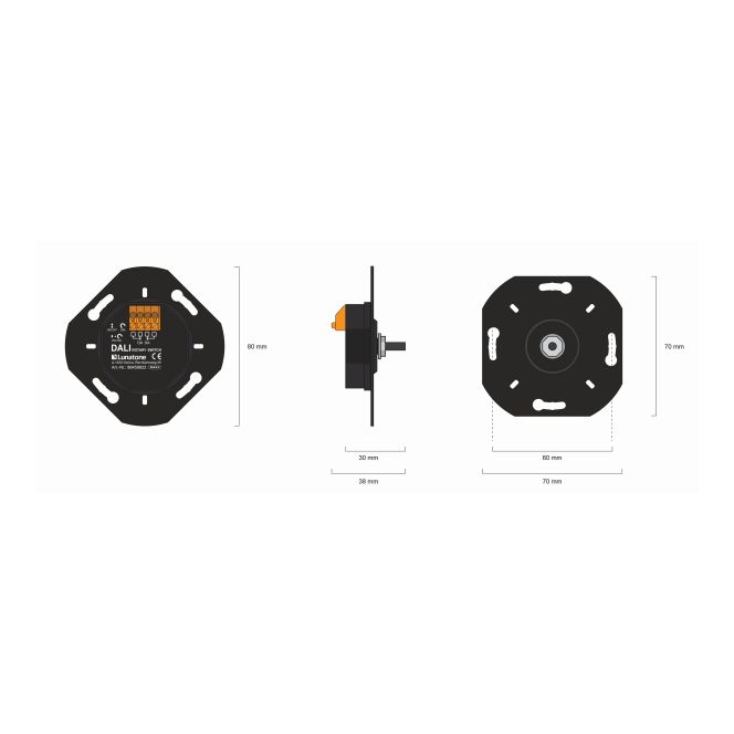 DALI ROT is a rotary knob basis to control the light level of DALI luminaires. Versions for Tunable White or RGB-capable luminaires are also available. The device was developed to fit the rotary covers and knobs of most manufacturers and to enable their integration in the DALI system.