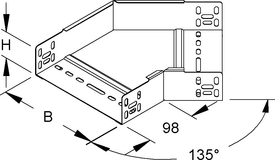Bogen 45°, mit ungelochten Seitenholmen, mit Verbinderlochung für den Anschluss, für Kabelrinnen, zur Herstellung von 45° horizontal abgewinkeltem Kabelrinnenverlauf, mit integrierten Stoßstellenverbindern, einschließlich anteilmäßigem Befestigungszubehör. Zur Verwendung im Funktionserhalt bitte Zusatzvorschriften beachten! VDE zertifiziert! für Kabelrinnen : 60 mm Kantenhöhe Abmessungen (ca. Maße) innen H x B : 60 x 202 mm Werkstoff : Stahl, bandverzinkt nach DIN EN 10346