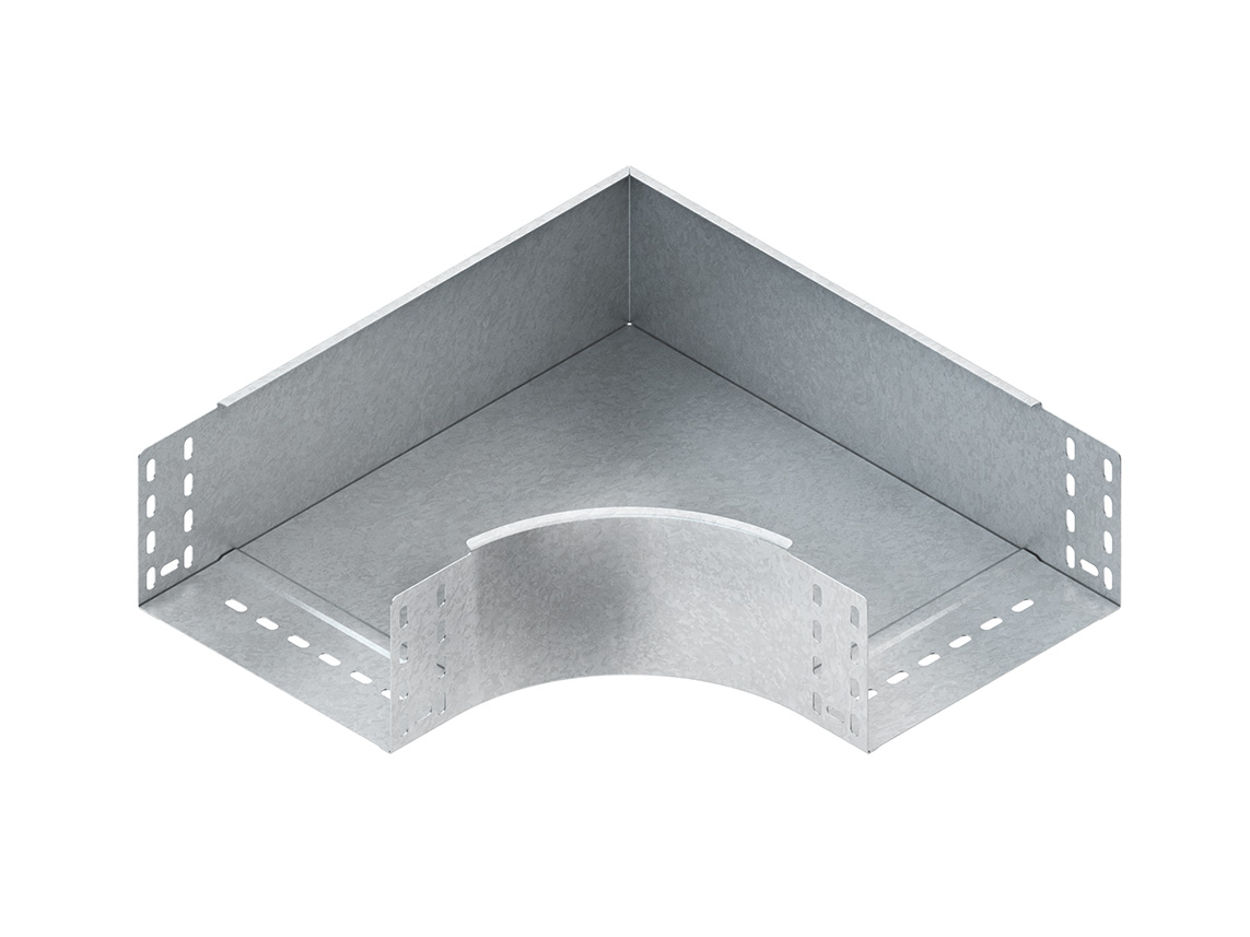 Bogen 90°, mit ungelochten Seitenholmen, mit Verbinderlochung für den Anschluss, für Kabelrinnen, zur Herstellung von horizontalen 90° Eckverbindungen, mit integrierten Stoßstellenverbindern, einschließlich anteilmäßigem Befestigungszubehör. für Kabelrinnen : 110 mm Kantenhöhe Abmessungen (ca. Maße) innen H x B : 110 x 102 mm Innenholmradius R : 138 mm Werkstoff : Stahl, bandverzinkt nach DIN EN 10346