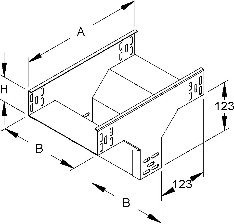 Abgangstrichter, quer, mit ungelochten Seitenholmen, mit Verbinderlochungen für den Anschluss, für Kabelrinnen, für den senkrechten Abzweig quer (rechtwinklig) zur Hauptrichtung, einschließlich anteilmäßigen Befestigungszubehör. Ausführung: Durchlaufende Rinnengröße = abgehende Rinnengröße VDE zertifiziert! für Kabelrinnen : 60 mm Kantenhöhe Abmessungen (ca. Maße) innen H x B : 60 x 302 mm Einsatzmaß A für die durchlaufende Rinne : 311 mm Werkstoff : Stahl, bandverzinkt nach DIN EN 10346
