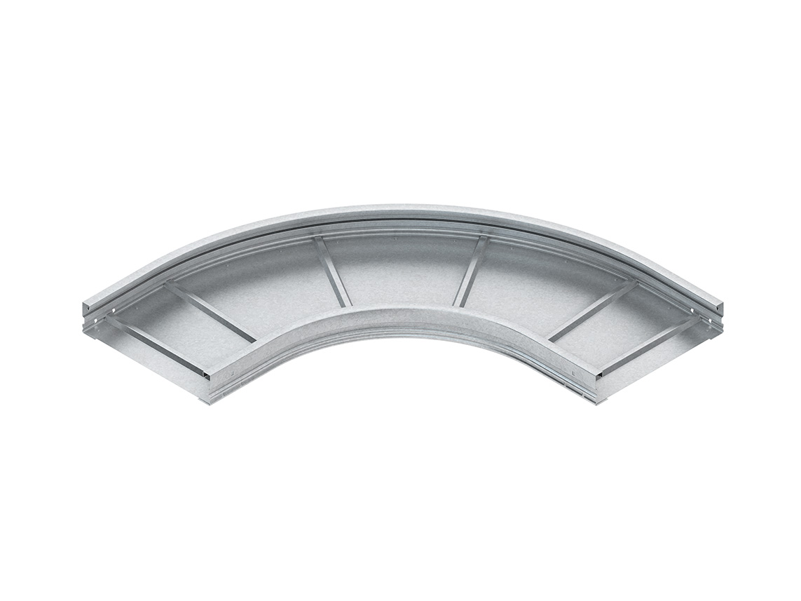 Bogen 90°, mit gesickten, runden und ungelochten Seitenholmen, mit Verbinderlochung für den Anschluss, für Weitspannkabelrinnen, formstabil durch den vollflächig eingenieteten, gesickten und ungelochten Boden, zur Herstellung von horizontalen 90° Abgängen. Stoßstellenverbinder WSV 105.390 bitte gesondert bestellen. Die Formstückradien sind so ausgelegt, dass die Verlegung der Kabel gemäß DIN/VDE 0298 Teil 3 erfolgen kann. Stoßstellen müssen in unmittelbarer Nähe durch eine entsprechende Tragkonstruktion unterstützt werden. Verwendbar für : Weitspannkabelrinne WRL 105... Weitspannkabelrinne WRU 105... Abmessungen (ca. Maße) Höhe H x Breite B : 105 x 200 mm Abmessungen außen : 750 mm + B Innenholmradius R : 500 mm Werkstoff : Stahl, bandverzinkt nach DIN EN 10346