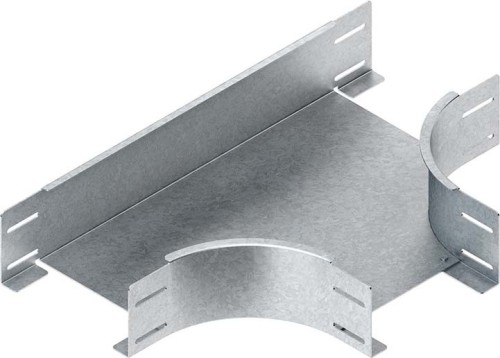 T-Stück, schwere Ausführung, mit ungelochten Seitenholmen jedoch mit Verbinderlochung für den Anschluss sowie mit integrierten Stoßstellenverbindern, zur Herstellung von horizontalen 90° T-Abgängen, für begehbare Kabelrinnen, einschließlich anteilmäßigen Befestigungszubehör. für begehbare Kabelrinnen : 100 mm Kantenhöhe Abmessungen (ca. Maße) H x B (innen) : 100 x 200 mm Materialstärke t : 2 mm Innenholmradius R : 138 mm Länge in Hauptrichtung : 385 mm + B Länge in Abgangsrichtung : 194 mm + B Werkstoff : Stahl, bandverzinkt nach DIN EN 10346